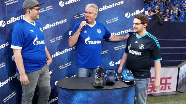 Um 20.01 Uhr war es soweit. Unter der Moderation von Stadionsprecher Dirk Oberschulte-Beckmann traten beide Kandidaten zum Schätzquiz um das ECHTE-KUMPEL-PAKET an, bestehend aus zwei VIP-Tickets für das Saisonfinale gegen den VfB Stuttgart, ein Paar ALBATROS Sicherheitsschuhe aus der SCHALKE-Edition, die sich die beiden vorher aussuchen konnten und eine ALBATROS Funktionsjacke.